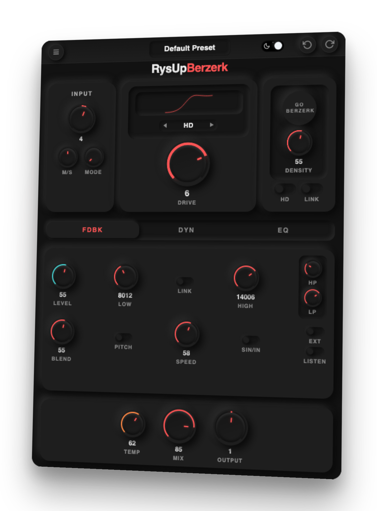 Blend, speed, low/high filters, and pitch on a post-drive feedback path. Sidechain-gated so it breathes with the source — wild when pushed, musical when restrained.